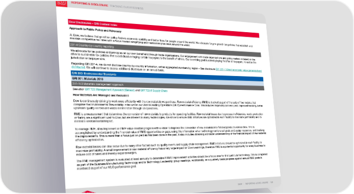 REPORTING & DISCLOSURE TRACKING OUR PROGRESS DOW | REPORTING & DISCLOSURE | 120 Dow Disclosures – GRI Content Index Approach to Public Policy and Advocacy At Dow, we believe that good tax policy fosters economic stability and better lives for people around the world. We advocate for pro-growth tax policies that establish and maintain competitive tax rates with a focus toward simplifying and harmonizing tax laws around the world. 207-4 Country-by-country reporting We advocate for tax policies and principles on our own behalf and through trade organizations. Our engagement with trade organizations and policy makers is based on the drive to sustainable tax policies that avoid disadvantaging certain taxpayers to the benefit of others. Our overriding goal is a level playing field for all taxpayers, no matter the jurisdiction or taxpayer size. Regarding GRI 207-4, we do not disclose country-by-country information, rather aggregated numbers by region – See disclosure GRI 201-1 Direct economic value generated and distributed . We will continue to assess additional disclosure on an annual basis. GRI 300: Environmental Standards GRI 301: Materials 2016 301-103 Materials management approach See also: GRI 103 Management Approach (General) and GRI 102-9 Supply Chain How Materials Are Managed and Evaluated Dow is continuously striving to work more efficiently with the raw materials we purchase. Raw material efficiency (RME) is tracked as part of the suite of four metrics that comprise the Environmental Stewardship Index under our World-Leading Operations (WLO) Performance Goal. This includes improving process yield, improved tracking, better upstream quality control and waste minimization through all operations. RME is a measurement that determines the conversion of raw materials to products for operating facilities. Raw material losses due to process inefficiencies, waste production or flaring are a significant cost to Dow, but are inherent in many technologies. We strive to ensure RME initiatives are optimized in each facility to maximize profitability and to minimize environmental impact. To manage RME, sites implement an RME value creation program with a vision to improve the conversion of raw materials into finished products across Dow. This is accomplished by understanding the financial value of RME opportunities or gaps, using this information when technology centers set goals and assign resources, and tracking the improvements. This is more than a focus just on yield as has been done in the past, it also includes obtaining a broader understanding of the financial impact of raw material efficiency optimization. Raw material losses can also occur due to many other factors such as quality events and supply chain management. RME initiatives should be optimized in each facility to maximize profitability. A small improvement in raw material efficiency has a very large impact on Dow’s earnings, therefore RME is a potential opportunity for every business to reduce cost of sales and thereby expand margins. The RME management system is evaluated at least annually to determine if RME improvement activities should be a focus area for that particular technology. This is completed as part of the Business Manufacturing Technology and/or Technology Leadership group meetings. Additionally, on a quarterly basis progress against annual RME goals is monitored as part of our WLO performance goal.