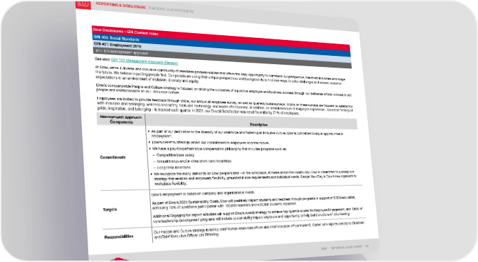 REPORTING & DISCLOSURE TRACKING OUR PROGRESS DOW | REPORTING & DISCLOSURE | 152 Dow Disclosures – GRI Content Index GRI 400: Social Standards GRI 401: Employment 2016 401-103 Management approach See also: GRI 103 Management Approach (General) At Dow, we’re a diverse and inclusive community of relentless problem-solvers that offers the daily opportunity to contribute our perspective, transform industries and shape the future. We believe in putting people first. Our people are using their unique perspectives and backgrounds to find new ways to solve challenges and exceed customer expectations in an environment of inclusion, diversity and equity. Dow’s companywide People and Culture strategy is focused on driving the outcomes of a positive employee and business success through our deliberate efforts to invest in ALL people and institutionalize an ALL IN clusive culture. Employees are invited to provide feedback through Voice, our annual all employee survey, as well as quarterly pulse surveys. Topics on these surveys are focused on satisfaction with inclusion and belonging, wellness and safety, tools and technology, and leader effectiveness. In addition, an overall measure of Employee Experience – based on feelings of pride, inspiration, and belonging – is tracked each quarter. In 2021, our Overall Satisfaction was rated favorable by 71% of employees. Management Approach Components Description Commitments • As part of our dedication to the diversity of our workforce and fostering an inclusive culture, Dow is committed to equal opportunities in employment. • Dow’s benefits offerings reflect our commitment to employees and their future. • We have a pay-for-performance compensation philosophy that includes programs such as: – Competitive base salary – Annual bonus and/or other short-term incentives – Long-term incentives • We recognize the many demands on Dow people’s time – in the workplace, at home and in the community. Dow is committed to a workplace strategy that enables and empowers flexibility, grounded in role requirements and individual needs. Design Your Day is Dow’s new approach to workplace flexibility. Targets Dow’s employment is based on company and organizational needs. As part of Dow’s 2025 Sustainability Goals, Dow will positively impact students and teachers through programs in support of STEM education, achieving 10% of workforce participation with 100,000 teachers and 500,000 students impacted. Additional Engaging for Impact activities will support Dow’s overall strategy to achieve top-quartile scores for Employee Engagement, and 100% of core leadership development programs will include sustainability impact exposure and opportunity to help build a culture of volunteering. Responsibilities Our People and Culture strategy is led by chief human resources officer and chief inclusion officer Karen S. Carter, who reports directly to Chairman and Chief Executive Officer Jim Fitterling.