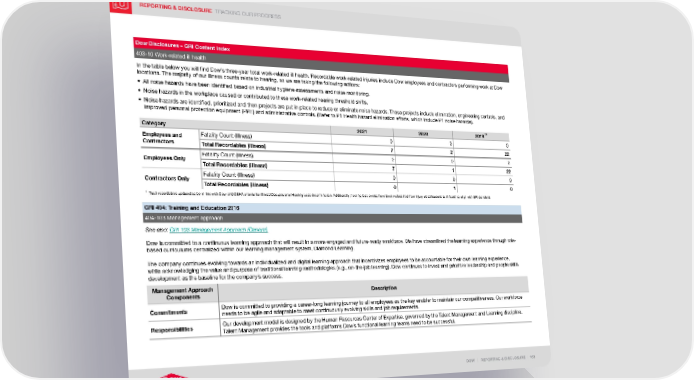 REPORTING & DISCLOSURE TRACKING OUR PROGRESS DOW | REPORTING & DISCLOSURE | 163 Dow Disclosures – GRI Content Index 403-10 Work-related ill health In the table below you will find Dow’s three-year total work-related ill health. Recordable work-related injuries include Dow employees and contractors performing work at Dow locations. The majority of our illness counts relate to hearing, so we are taking the following actions: • All noise hazards have been identified based on industrial hygiene assessments and noise monitoring. • Noise hazards in the workplace caused or contributed to these work-related hearing threshold shifts. • Noise hazards are identified, prioritized and then projects are put in place to reduce or eliminate noise hazards. These projects include elimination, engineering controls, and improved personal protection equipment (PPE) and administrative controls. (Refer to P1 Health hazard elimination efforts, which include P1 noise hazards). Category 2021 2020 2019 1 Employees and Contractors Fatality Count (Illness) 0 0 0 Total Recordables (Illness) 7 2 22 Employees Only Fatality Count (Illness) 0 0 0 Total Recordables (Illness) 7 1 22 Contractors Only Fatality Count (Illness) 0 0 0 Total Recordables (Illness) 0 1 0 1 Total recordables updated to be in line with Dow and OSHA criteria for illness/Occupational Hearing Loss determination. Additionally, hearing loss events have been reclassified from injury classifications to ill health to align with GRI standard. GRI 404: Training and Education 2016 404-103 Management approach See also: GRI 103 Management Approach (General) Dow is committed to a continuous learning approach that will result in a more engaged and future-ready workforce. We have streamlined the learning experience through role- based curriculums centralized within our learning management system, Diamond Learning. The company continues evolving towards an individualized and digital learning approach that incentivizes employees to be accountable for their own learning experience, while acknowledging the value and purpose of traditional learning methodologies (e.g., on-the-job learning). Dow continues to invest and prioritize leadership and people skills development as the baseline for the company’s success. Management Approach Components Description Commitments Dow is committed to providing a career-long learning journey to all employees as the key enabler to maintain our competitiveness. Our workforce needs to be agile and adaptable to meet continuously evolving skills and job requirements. Responsibilities Our development model is designed by the Human Resources Center of Expertise, governed by the Talent Management and Learning discipline. Talent Management provides the tools and platforms Dow’s functional learning teams need to be successful.