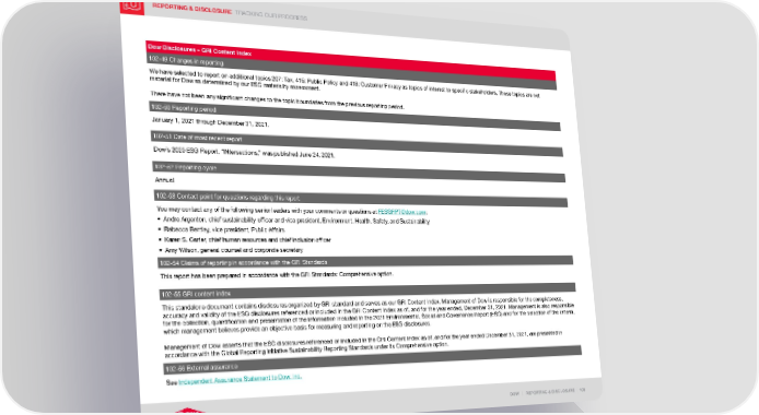 REPORTING & DISCLOSURE TRACKING OUR PROGRESS DOW | REPORTING & DISCLOSURE | 108 Dow Disclosures – GRI Content Index 102-49 Changes in reporting We have selected to report on additional topics 207: Tax, 415: Public Policy and 418: Customer Privacy as topics of interest to specific stakeholders. These topics are not material for Dow as determined by our ESG materiality assessment. There have not been any significant changes to the topic boundaries from the previous reporting period. 102-50 Reporting period January 1, 2021 through December 31, 2021. 102-51 Date of most recent report Dow’s 2020 ESG Report, “INtersections,” was published June 24, 2021. 102-52 Reporting cycle Annual 102-53 Contact point for questions regarding this report You may contact any of the following senior leaders with your comments or questions at [email protected] : • Andre Argenton, chief sustainability officer and vice president, Environment, Health, Safety, and Sustainability • Rebecca Bentley, vice president, Public Affairs • Karen S. Carter, chief human resources and chief inclusion officer • Amy Wilson, general counsel and corporate secretary 102-54 Claims of reporting in accordance with the GRI Standards This report has been prepared in accordance with the GRI Standards: Comprehensive option. 102-55 GRI content index This standalone document contains disclosures organized by GRI standard and serves as our GRI Content Index. Management of Dow is responsible for the completeness, accuracy and validity of the ESG disclosures referenced or included in the GRI Content Index as of, and for the year ended, December 31, 2021. Management is also responsible for the collection, quantification and presentation of the information included in the 2021 Environmental, Social and Governance Report (ESG) and for the selection of the criteria, which management believes provide an objective basis for measuring and reporting on the ESG disclosures. Management of Dow asserts that the ESG disclosures referenced or included in the GRI Content Index as of, and for the year ended December 31, 2021, are presented in accordance with the Global Reporting Initiative Sustainability Reporting Standards under its Comprehensive option. 102-56 External assurance See Independent Assurance Statement to Dow, Inc.