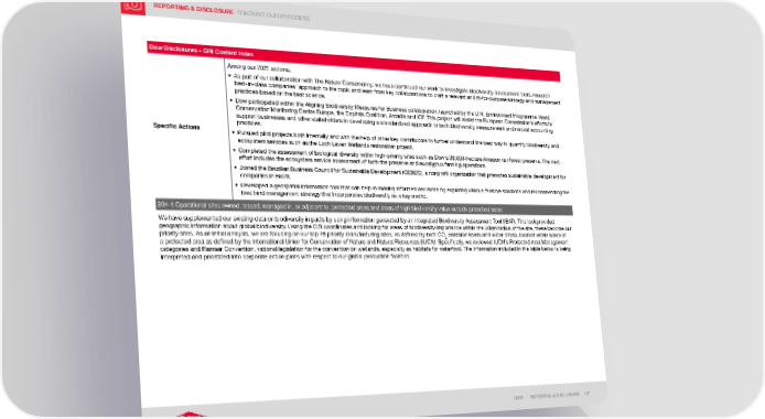REPORTING & DISCLOSURE TRACKING OUR PROGRESS DOW | REPORTING & DISCLOSURE | 137 Dow Disclosures – GRI Content Index Specific Actions Among our 2021 actions: • As part of our collaboration with The Nature Conservancy, we have continued our work to investigate biodiversity assessment tools, research best-in-class companies’ approach to the topic and learn from key collaborations to craft a relevant and fit-for-purpose strategy and management practices based on the best science. • Dow participated within the Aligning Biodiversity Measures for Business collaboration, launched by the U.N. Environment Programme World Conservation Monitoring Centre Europe, the Capitals Coalition, Arcadis and ICF. This project will assist the European Commission’s efforts to support businesses and other stakeholders in developing a standardized approach to both biodiversity measurement and natural accounting practices. • Pursued pilot projects both internally and with the help of other key contributors to further understand the best way to quantify biodiversity and ecosystem services such as the Loch Leven Wetlands restoration project. • Completed the assessment of biological diversity within high-priority sites such as Dow’s 38,000-hectare Amazon rainforest preserve. The next effort includes the ecosystem service assessment of both the preserve and eucalyptus farming operations. • Joined the Brazilian Business Council for Sustainable Development (CEBDS), a nonprofit organization that promotes sustainable development for companies in Brazil. • Developed a geospatial information tool that can help in making informed decisions by exploring various feasible solutions and recommending the best land management strategy that incorporates biodiversity as a key metric. 304-1 Operational sites owned, leased, managed in, or adjacent to, protected areas and areas of high biodiversity value outside protected areas We have supplemented our existing data on biodiversity impacts by using information generated by an Integrated Biodiversity Assessment Tool (IBAT). This tool provided geographic information about global biodiversity. Using the GIS coordinates and looking for areas of biodiversity importance within the 50km radius of the site, these become our priority sites. As an initial analysis, we are focusing on our top 28 priority manufacturing sites, as defined by both CO 2 emission levels and water stress, located within 50km of a protected area as defined by the International Union for Conservation of Nature and Natural Resources (IUCN). Specifically, we reviewed IUCN’s Protected Area Management categories and Ramsar Convention, national legislation for the convention on wetlands, especially as habitats for waterfowl. The information included in the table below is being interpreted and prioritized into corporate action plans with respect to our global production facilities.