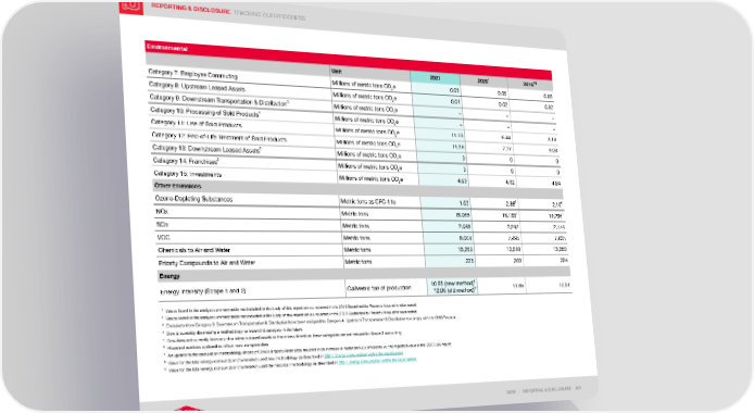 REPORTING & DISCLOSURE TRACKING OUR PROGRESS DOW | REPORTING & DISCLOSURE | 201 Environmental Unit 2021 2020 1 2019 2 Category 7: Employee Commuting Millions of metric tons CO 2 e 0.05 0.05 0.09 Category 8: Upstream Leased Assets Millions of metric tons CO 2 e 0.01 0.02 0.02 Category 9: Downstream Transportation & Distribution 3 Millions of metric tons CO 2 e – – – Category 10: Processing of Sold Products 4 Millions of metric tons CO 2 e – – – Category 11: Use of Sold Products Millions of metric tons CO 2 e 11.13 6.44 3.18 Category 12: End-of-Life Treatment of Sold Products Millions of metric tons CO 2 e 11.96 7.27 9.03 Category 13: Downstream Leased Assets 5 Millions of metric tons CO 2 e 0 0 0 Category 14: Franchises 5 Millions of metric tons CO 2 e 0 0 0 Category 15: Investments Millions of metric tons CO 2 e 4.59 4.92 4.84 Other Emissions Ozone-Depleting Substances Metric tons as CFC-11e 1.52 2.88 6 2.10 6 NOx Metric tons 18,068 18,133 7 19,236 7 SOx Metric tons 2,048 2,242 2,774 VOC Metric tons 8,004 7,495 7,635 Chemicals to Air and Water Metric tons 15,256 13,910 13,959 Priority Compounds to Air and Water Metric tons 225 209 294 Energy Energy Intensity (Scope 1 and 2) GJ/Metric ton of production 10.85 (new method) 8 12.06 (old method) 9 11.86 12.31 1 Values listed in the analyst summary table not included in the body of this report are as reported in the 2019 Sustainability Report unless otherwise noted. 2 Values listed in the analyst summary table not included in the body of this report are as reported in the 2020 Sustainability Report unless otherwise noted. 3 Emissions from Category 9: Downstream Transportation & Distribution have been realigned to Category 4: Upstream Transportation & Distribution to comply with the GHG Protocol. 4 Dow is currently developing a methodology to report this category in the future. 5 Dow does not currently have any downstream leased assets or franchises; therefore, these categories are not relevant for Scope 3 accounting. 6 Historical numbers updated to reflect more complete data. 7 An update to the calculation methodology at one of Dow’s largest silicon sites resulted in an increase in historical NOx emissions vs. the reported value in the 2020 ESG report. 8 Value for the total energy consumption (numerator) used new methodology as described in 302-1 Energy consumption within the organization . 9 Value for the total energy consumption (numerator) used the historical methodology as described in 302-1 Energy consumption within the organization .