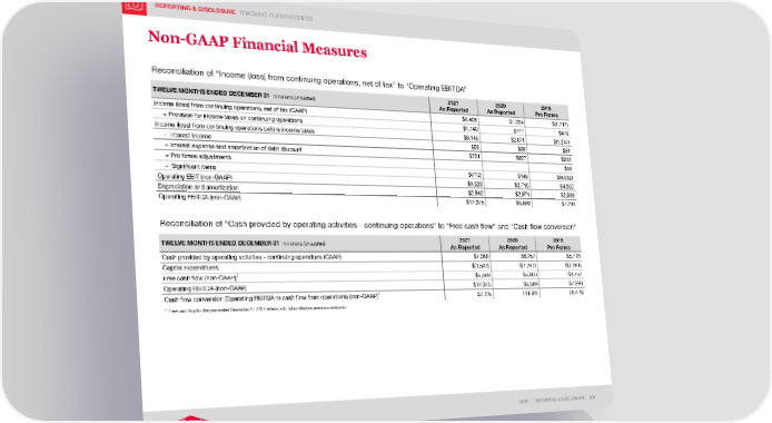 REPORTING & DISCLOSURE TRACKING OUR PROGRESS DOW | REPORTING & DISCLOSURE | 208 Non-GAAP Financial Measures Reconciliation of “Income (loss) from continuing operations, net of tax” to “Operating EBITDA” TWELVE MONTHS ENDED DECEMBER 31 In millions (Unaudited) 2021 As Reported 2020 As Reported 2019 Pro Forma Income (loss) from continuing operations, net of tax (GAAP) $6,405 $1,294 $(1,717) + Provision for income taxes on continuing operations $1,740 $777 $470 Income (loss) from continuing operations before income taxes $8,145 $2,071 $(1,247) - Interest income $55 $38 $81 + Interest expense and amortization of debt discount $731 $827 $933 + Pro forma adjustments $65 - Significant items $(712) $145 $(4,682) Operating EBIT (non-GAAP) $9,533 $2,715 $4,352 Depreciation and amortization $2,842 $2,874 $2,938 Operating EBITDA (non-GAAP) $12,375 $5,589 $7,290 Reconciliation of “Cash provided by operating activities - continuing operations” to “Free cash flow” and “Cash flow conversion” TWELVE MONTHS ENDED DECEMBER 31 In millions (Unaudited) 2021 As Reported 2020 As Reported 2019 Pro Forma Cash provided by operating activities – continuing operations (GAAP) $7,069 $6,252 $5,713 Capital expenditures $(1,501) $(1,252) $(1,961) Free cash flow (non-GAAP) 1 $5,568 $5,000 $3,752 Operating EBITDA (non-GAAP) $12,375 $5,589 $7,290 Cash flow conversion (Operating EBITDA to cash flow from operations) (non-GAAP) 1 57.1% 111.9% 78.4 % 1 Free cash flow for the year ended December 31, 2021 reflects a $1 billion elective pension contribution.