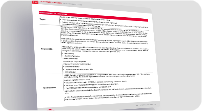 REPORTING & DISCLOSURE TRACKING OUR PROGRESS DOW | REPORTING & DISCLOSURE | 170 Dow Disclosures – GRI Content Index Targets Specific targets within our Engaging for Impact 2025 Sustainability Goal include: • 70% of Dow employees will contribute time and expertise through volunteer engagement. • Positively contribute to Dow’s enterprise goals on overall employee satisfaction and the employee experience metric – through significantly higher than average favorable scores for employees who volunteer. Responsibilities Dow’s philanthropic work is governed by two teams – the Dow Company Foundation’s Board of Directors and the Corporate Contributions Committee. The Foundation is a separately governed, private foundation designed to carry out the charitable efforts of Dow. Its Board of Directors consists of 10 voting members, as well as one retiree and five officers. The Corporate Contributions Committee consists of nine voting members and one officer. Officers advise the members on charitable matters related to legal, tax and finance. Dow’s Office of Ethics and Compliance also plays a key advisory role. Local and inclusive committees exist within each region to review grant requests. Regional grant requests of $50,000 and above are reviewed by a global committee. Grant requests of $300,000 and above go to the Dow Company Foundation Board or Corporate Contributions Committee for review, approval or declination. Additionally, Dow employees collaborate across communities to develop and implement local community programs to address unmet needs. Dow works closely with nonprofit partners, including local United Way chapters, to understand the needs of the communities and prioritize resources. Among the needs addressed in communities around the world where Dow operates in 2021: • Food insecurity • Education infrastructure • Health infrastructure • Well-being of Indigenous people • Opportunity for students with disabilities • Environmental literacy • Long-term career and entrepreneurial skills • COVID-19 relief Specific Actions In 2021, charitable contributions totaled $32.4MM. Dow provided 888 grants in 2021 to 653 partner organizations, and 50% of Dow employees reported volunteering. The charitable organizations that received Dow funding last year reported on priority impacts. Investment highlights from 2021 include: • $350,000 committed for new ALL IN ERG Fund projects to promote equity, inclusion and diversity. • 8 Business Impact Fund projects totaling $2MM awarded for shared value projects. • New STEM partnership with Teach for All initiated with $300,000 grant. Additionally, the Global Employee Relief Fund supported employees and their families through Hurricane Ida, Hurricane Nicholas and flooding in India. In 2021, Dow launched a Community Opinion and Needs Assessment initiative, designed to further inform Dow’s approach with data-based and objective insights into the needs of strategic Dow communities (defined as cities near large Dow manufacturing facilities).
