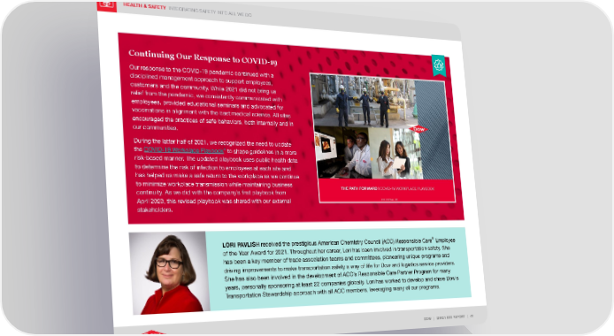 HEALTH & SAFETY INTEGRATING SAFETY INTO ALL WE DO DOW | 2021 ESG REPORT | 41 LORI PAVLISH received the prestigious American Chemistry Council (ACC) Responsible Care ® Employee of the Year Award for 2021. Throughout her career, Lori has been involved in transportation safety. She has been a key member of trade association teams and committees, pioneering unique programs and driving improvements to make transportation safety a way of life for Dow and logistics service providers. She has also been involved in the development of ACC’s Responsible Care Partner Program for many years, personally sponsoring at least 22 companies globally. Lori has worked to develop and share Dow’s Transportation Stewardship approach with all ACC members, leveraging many of our programs. Continuing Our Response to COVID-19 Our response to the COVID-19 pandemic continued with a disciplined management approach to support employees, customers and the community. While 2021 did not bring us relief from the pandemic, we consistently communicated with employees, provided educational seminars and advocated for vaccinations in alignment with the best medical science. All sites encouraged the practices of safe behaviors, both internally and in our communities. During the latter half of 2021, we recognized the need to update the COVID-19 Workplace Playbook to shape guidelines in a more risk-based manner. The updated playbook uses public health data to determine the risk of infection to employees at each site and has helped us make a safe return to the workplace as we continue to minimize workplace transmission while maintaining business continuity. As we did with the company’s first playbook from April 2020, this revised playbook was shared with our external stakeholders.