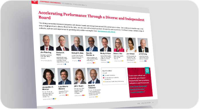 DOW | 2021 ESG REPORT | 77 CORPORATE GOVERNANCE INSTRUMENTAL TO ACCOUNTABILITY Accelerating Performance Through a Diverse and Independent Board The strong connection between companies with diverse boards and strong financial and ESG performance is clear. Dow continues to lead the way in this area, bringing not just a diverse Board to the table, but also one with a broad spectrum of expertise and experience. Our Board brings a valuable range of outlooks, opinions and experiences to governing and problem-solving for Dow. See disclosure GRI 102-22 . Jim Fitterling Chairman and Chief Executive Officer, Dow Inc. White/Man/LGBTQ+ Jeff M. Fettig Former Chairman and Chief Executive Officer, Whirlpool Corporation White/Man Gaurdie Banister Jr. Former President and Chief Executive Officer, Aera Energy LLC Black/Man Wesley G. Bush Former Chairman and Chief Executive Officer, Northrop Grumman Corporation White/Man Jacqueline C. Hinman Former Chairman, President and Chief Executive Officer, CH2M HILL White/Woman Richard K. Davis Lead Director, Dow President and Chief Executive Officer, Make-A-Wish America White/Man Samuel R. Allen Former Chairman and Chief Executive Officer, Deere & Company White/Man Debra L. Dial Senior Vice President and Controller, AT&T Inc. White/Woman Jerri DeVard Former Executive Vice President and Chief Customer Officer for Office Depot, Inc. Black/Woman Jill S. Wyant President and Chief Executive Officer, Madison Indoor Air Quality White/Woman Daniel W. Yohannes Former U.S. Ambassador to the Organisation for Economic Co-operation and Development Black/Man Luis Alberto Moreno Managing Director, Allen & Co LLC Latino/Man Board Committees Audit Corporate Governance Compensation and Leadership Development Environment, Health, Safety & Technology Learn more about our corporate governance framework, best practices, initiatives and framework. 2022 Proxy Statement Board of Directors Board Committees
