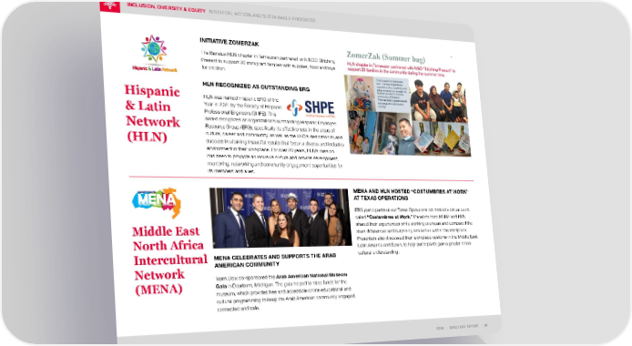 INITIATIVE ZOMERZAK The Benelux HLN chapter in Terneuzen partnered with NGO Stitching Present to support 20 immigrant families with supplies, food and toys for children. HLN RECOGNIZED AS OUTSTANDING ERG HLN was named Hispanic ERG of the Year in 2021 by the Society of Hispanic Professional Engineers (SHPE). This award recognizes an organization’s outstanding Hispanic Employee Resource Group (ERG), specifically its effectiveness in the areas of culture, career and community, as well as the ERG’s dedication to and success in attaining impactful results that foster a diverse and inclusive environment in their workplace. For over 20 years, HLN’s mission has been to promote an inclusive culture and provide development, mentoring, networking and community engagement opportunities for its members and allies. DOW | 2021 ESG REPORT | 49 INCLUSION, DIVERSITY & EQUITY INTENTION, ACTION AND SUSTAINABLE PROGRESS MENA CELEBRATES AND SUPPORTS THE ARAB AMERICAN COMMUNITY Team Dow co-sponsored the Arab American National Museum Gala in Dearborn, Michigan. The gala helped to raise funds for the museum, which provides free and accessible online educational and cultural programming to keep the Arab American community engaged, connected and safe. MENA AND HLN HOSTED “COSTUMBRES AT WORK” AT TE X AS OPER ATIONS ERG participants at our Texas Operations co-hosted a virtual event called “Costumbres at Work.” Panelists from MENA and HLN shared their experiences while working overseas and compared the stark differences and surprising similarities within the workplace. Presenters also discussed their workplace customs in the Middle East, Latin America and Spain, to help participants gain a greater cross- cultural understanding. Hispanic & Latin Network (HLN) Middle East North Africa Intercultural Network (MENA)